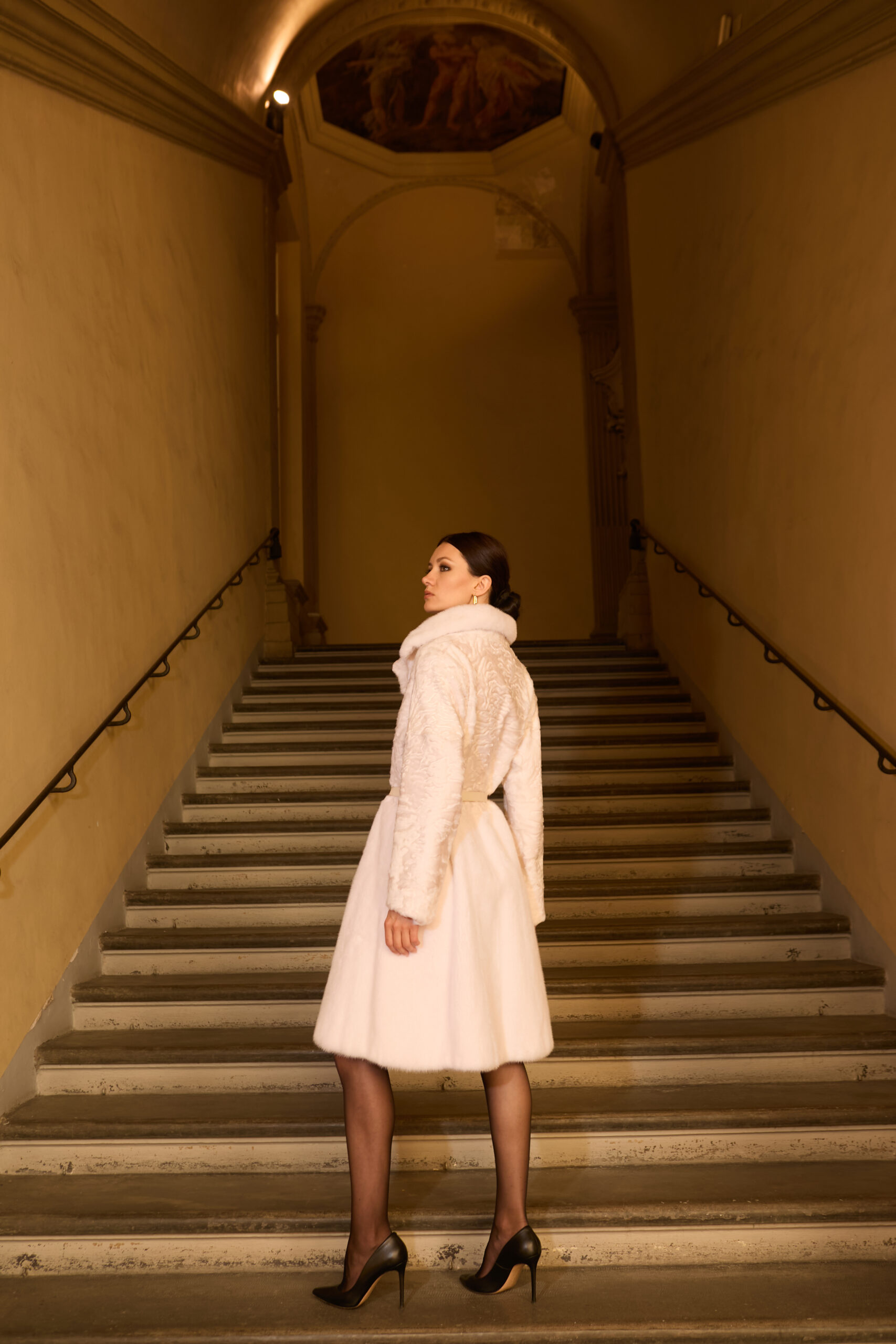 Cappotto in persiano kalgan con collo e fondo in visone bianco naturale